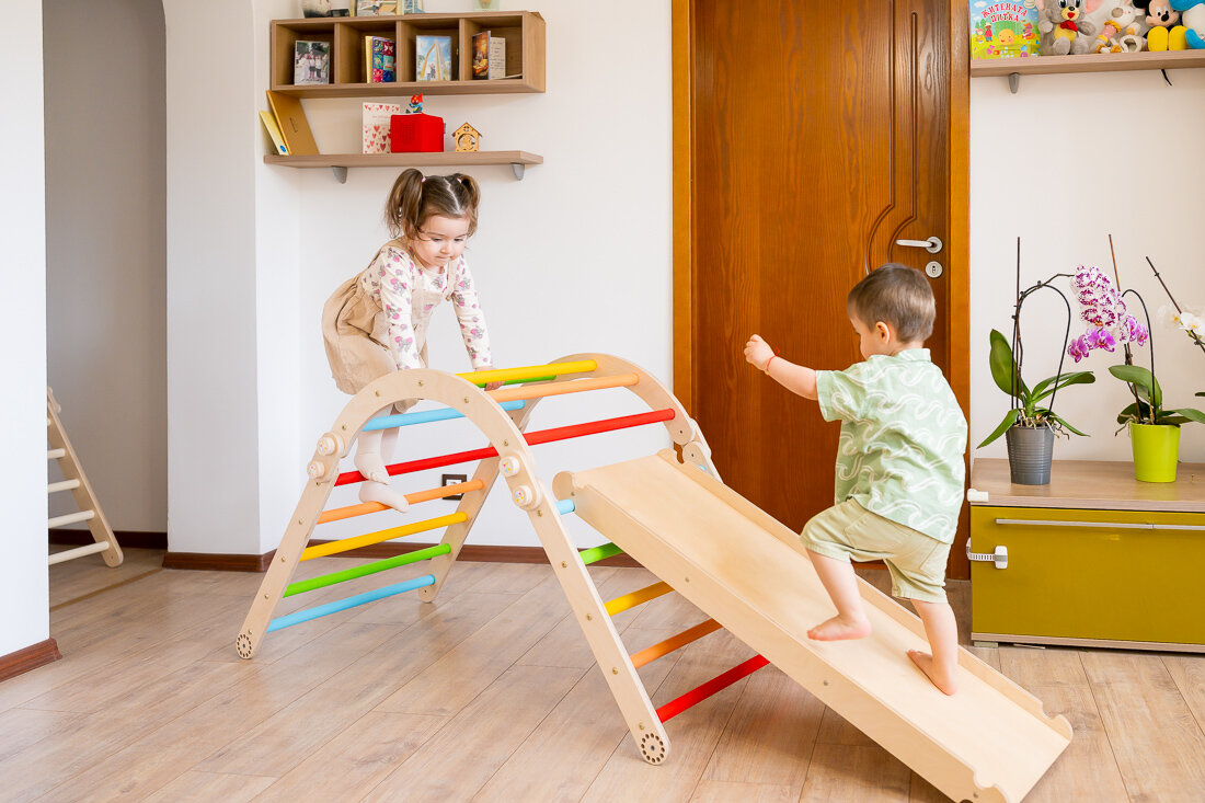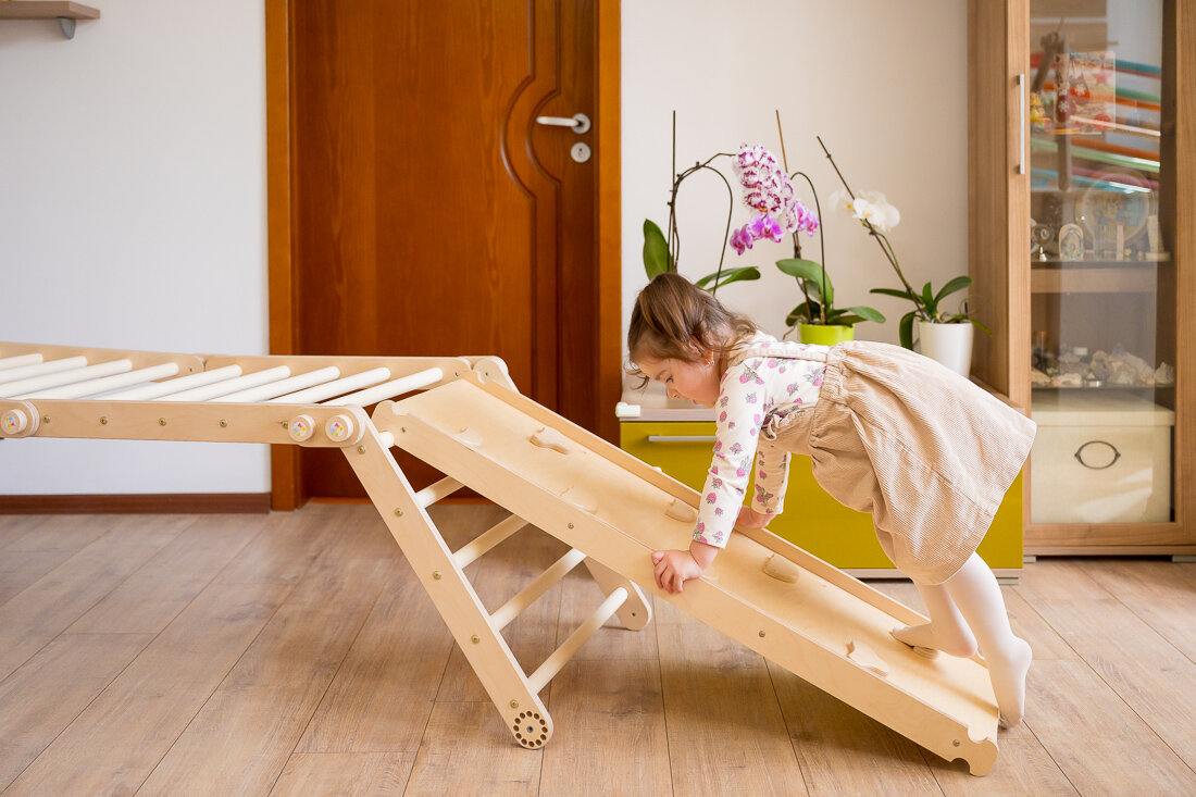 Este aproape imposibil ca Triunghiul Pikler să plictisească un copil, dar dacă totuși se întâmplă, accesoriile vin în ajutor – rampa/toboganul și arcul de cățărare. Cu ajutorul acestor accesorii, poți transforma cu ușurință camera într-un adevărat parc de distracții, perfect pentru a consuma energia fără limite a copiilor.