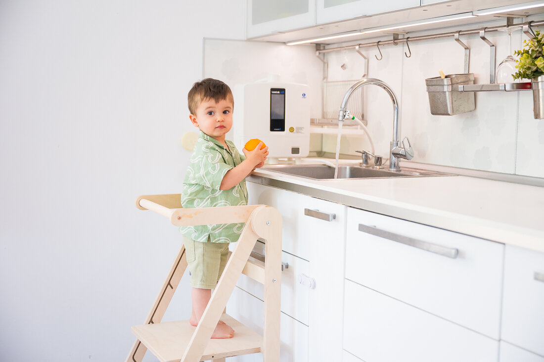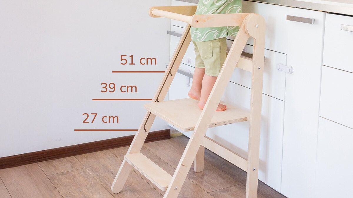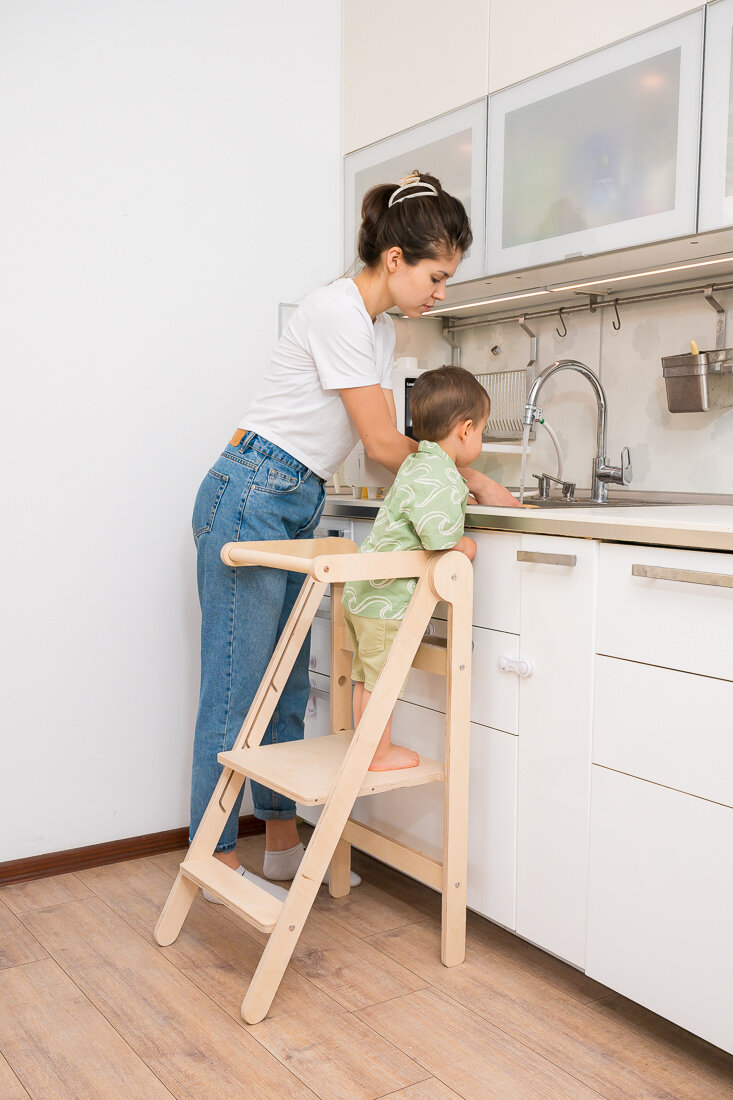 Aici vine în ajutor turnul proiectat după metoda Montessori. Această piesă de mobilier le oferă copiilor libertate de mișcare – pot urca și coborî singuri, fără mama sau tata. Doar copiii știu cât de minunat este să ajungi singur la bucătărie, să-ți torni apă, să-ți speli mânuțele sau să iei o gustare fără ca mama să întrerupă gătitul. Iar când s-au plictisit să ajute, pot coborî în siguranță. Sentimentul de independență este incredibil, nu doar pentru adulți, ci și pentru micuții noștri. 😊