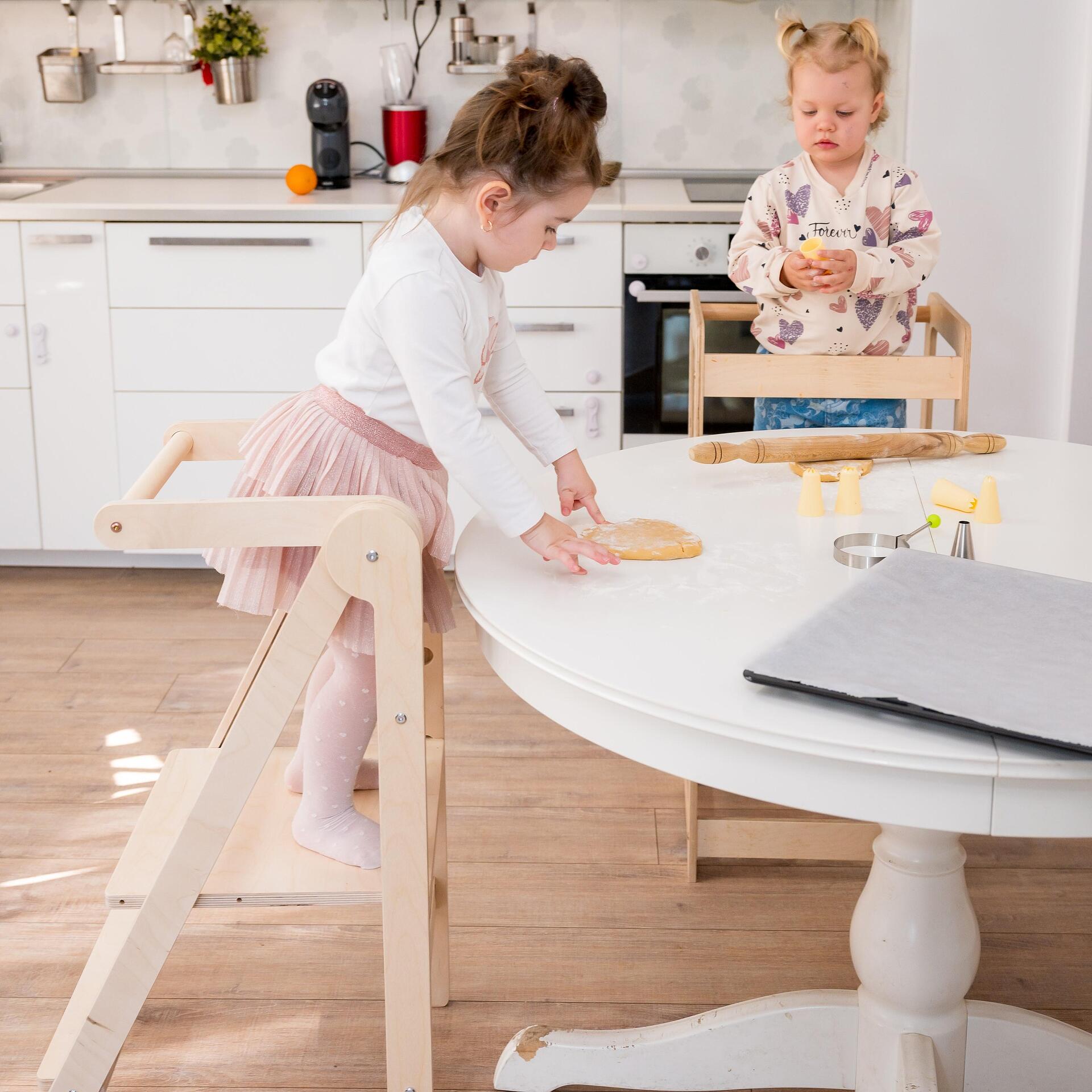 Pentru ca cei mici să ajungă la blatul din bucătărie, mulți părinți folosesc inițial un scaun obișnuit. Ulterior însă, devine clar că scaunul nu este cea mai sigură soluție. Mai ales pentru copiii mai mici, urcarea pe scaun este dificilă și riscantă și poate duce ușor la accidente.