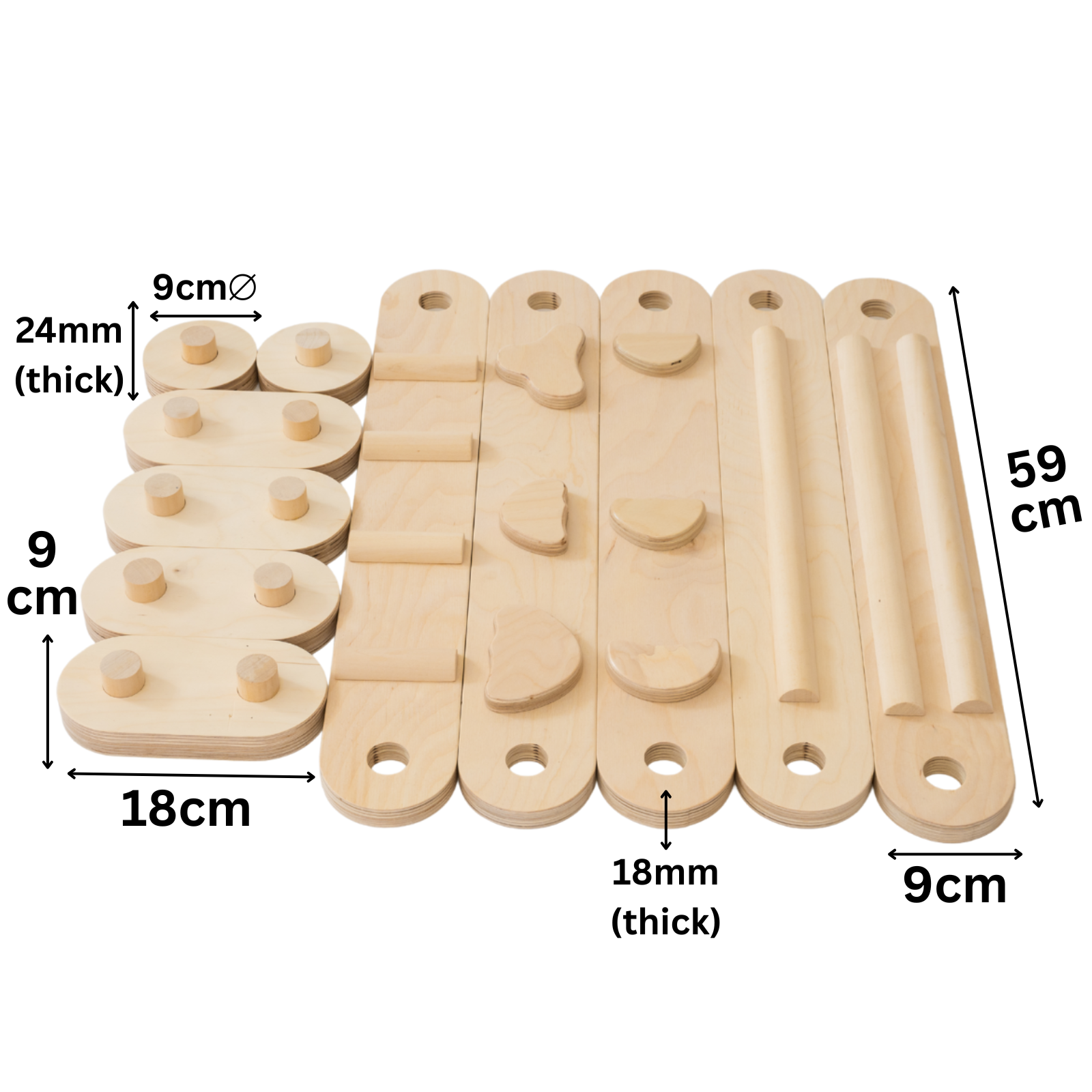 Setul include 5 bare, 4 conectori dubli și 2 simpli. Fiecare bară are pe o parte forme diferite, iar pe cealaltă parte o suprafață netedă – pentru o stimulare senzorială și motorie variată.