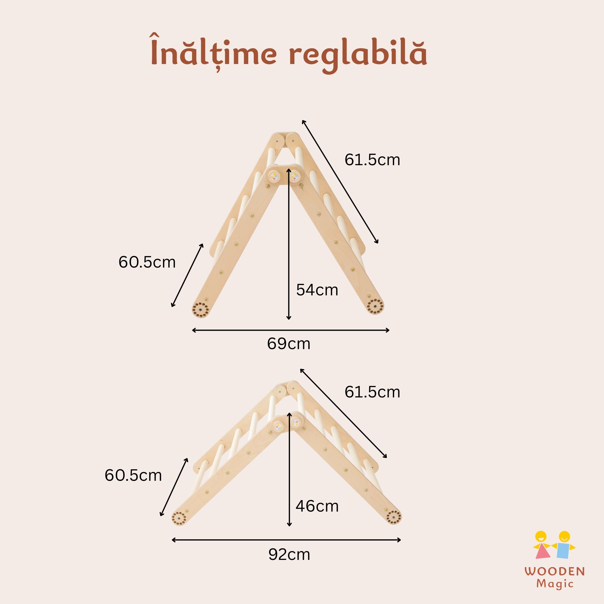 Triunghiul nostru Pikler poate fi asamblat la diferite înălțimi rapid și ușor, fără instrumente. Cand copilul este inca mic, triunghiul poate fi asamblat sub 120° si copilului ii va fi foarte usor sa urce. Când copilul se simte în siguranță și suficient de curajos, triunghiul poate fi asamblat mai abrupt.