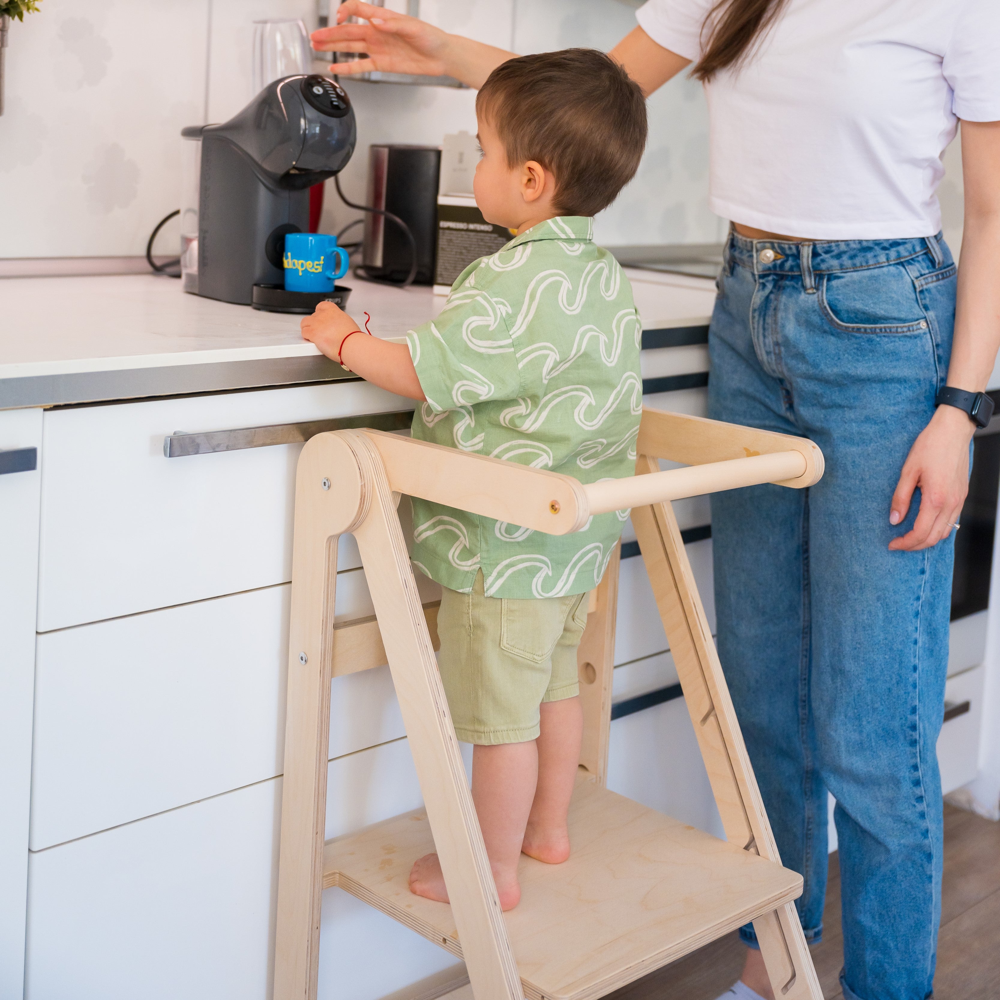 Turnul de învățare Montessori este conceput pentru a sprijini dezvoltarea copilului tău de la vârsta de bebeluș până la preșcolar. Acest turn versatil combină practicitatea unui cadru pliabil cu beneficiul suplimentar al reglării pe înălțime. Fie că cel mic ajută în bucătărie, se spală pe dinți sau explorează noi activități zilnice, turnul oferă un mod sigur, distractiv și interactiv de implicare în rutina zilnică.