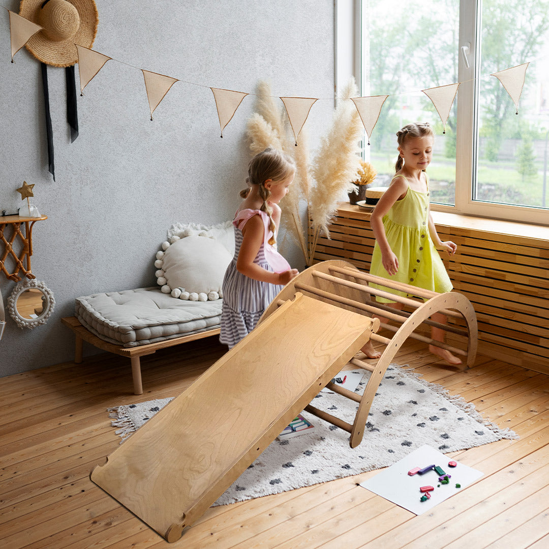 O rampă 2 în 1 pentru cățărare și alunecare poate fi adăugată la arc. Și acestea sunt doar câteva dintre opțiuni! Arcul poate fi folosit si pe post de balansoar, extrem de confortabil cu perna moale din material textil. De asemenea, ca mini cort, poartă de fotbal, coș de jucării (cu fața la perete) sau gimnastică activă dacă agățați jucării suspendate :)