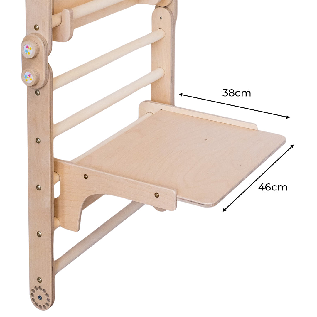 Masa este ușor de atârnat pe peretele suedez pe principiul asamblării uscate. De asemenea, poate fi atârnată pe un set de cățărare format din 3 module.
