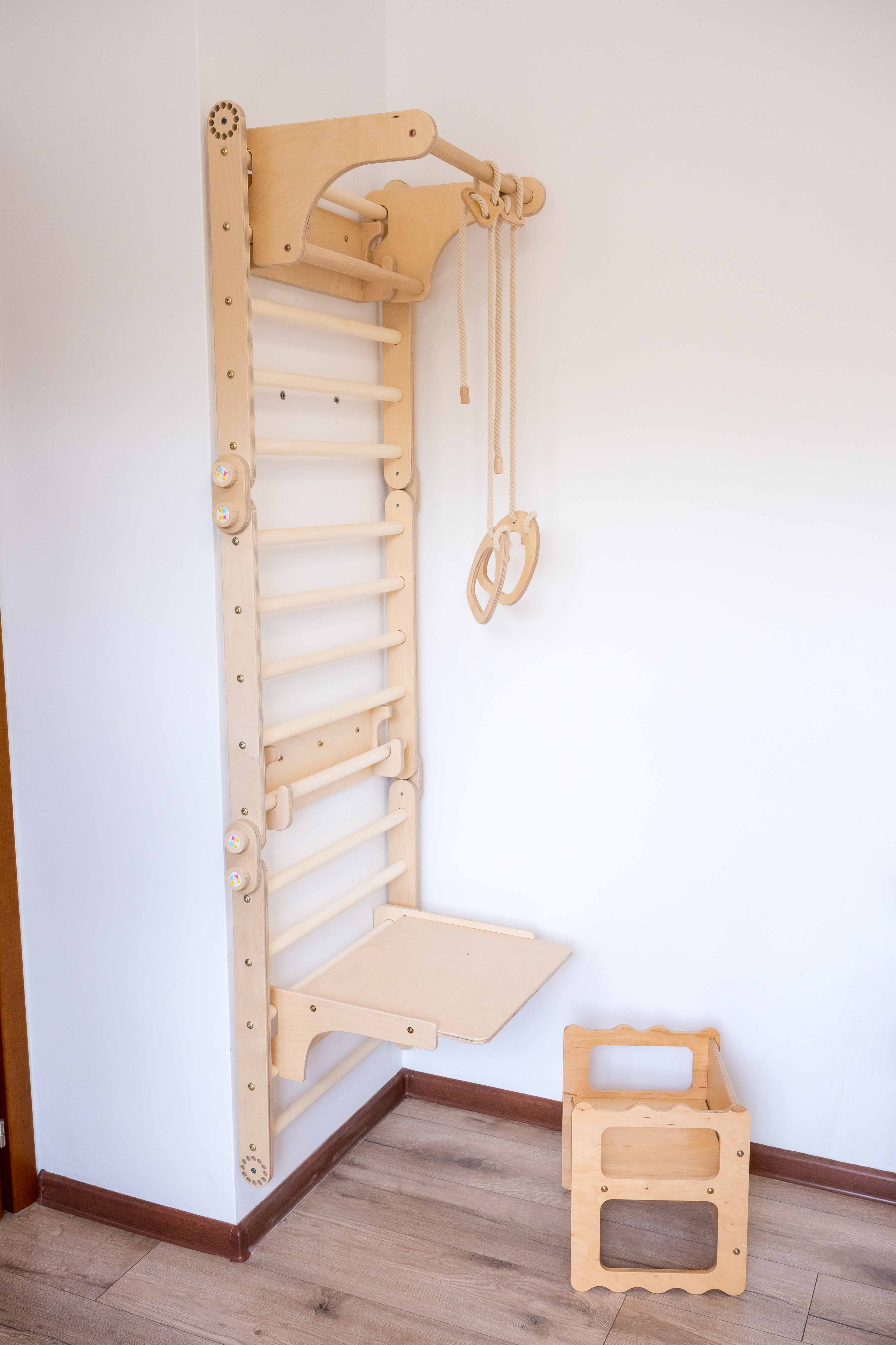 - economisește spațiu - cu ajutorul atașamentului de masă și scaun, peretele suedez se transformă într-un birou pentru cărți de colorat, teme de scris și tot felul de activități creativ