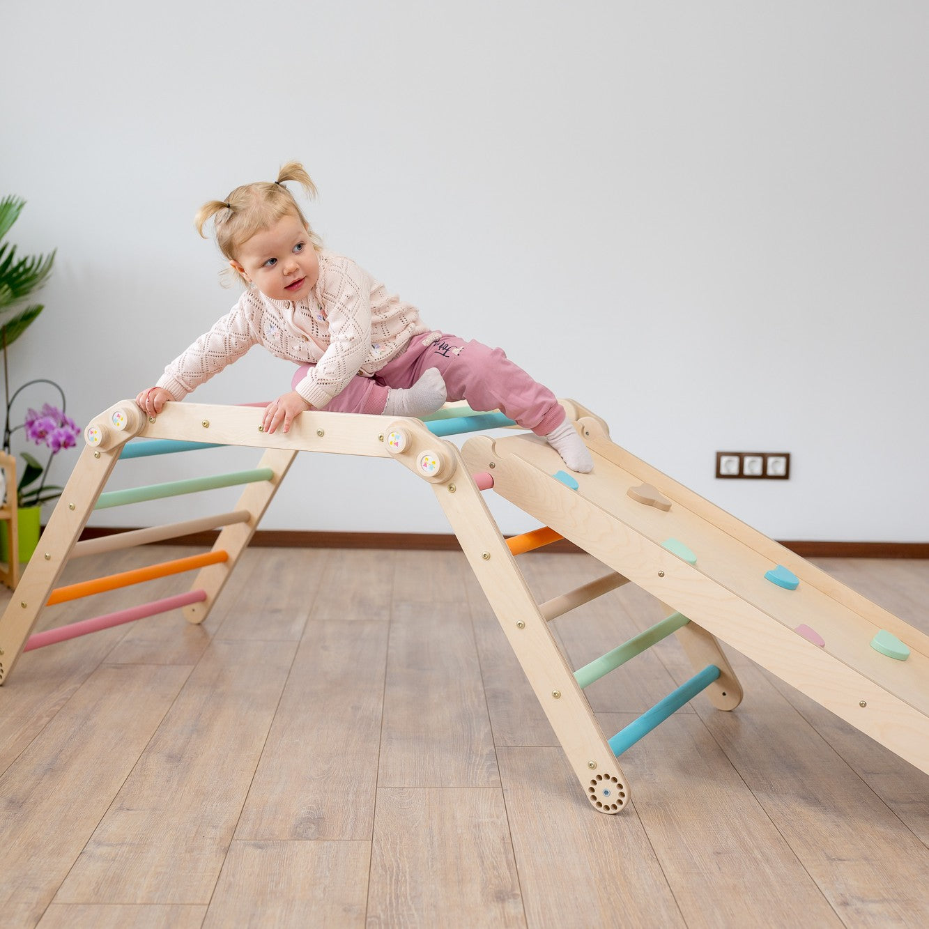 Toate seturile noastre de cățărare sunt modulare, permițând ca modulele individuale să fie legate între ele și ca ansamblurile să fie schimbate și îmbunătățite în funcție de dezvoltarea și interesele copilului. Pentru peretele suedez, folosim aceleași module (scări) din care sunt făcute triunghiurile Pickler, adăugând câteva atașamente și accesorii suplimentare pentru și mai multă distracție. Pentru a realiza peretele suedez, cele trei scări sunt pliate la 180° și devine o singură scară mare. Aceasta este ușor de ridicat și de agățat pe atașamentul deja montat pentru perete.