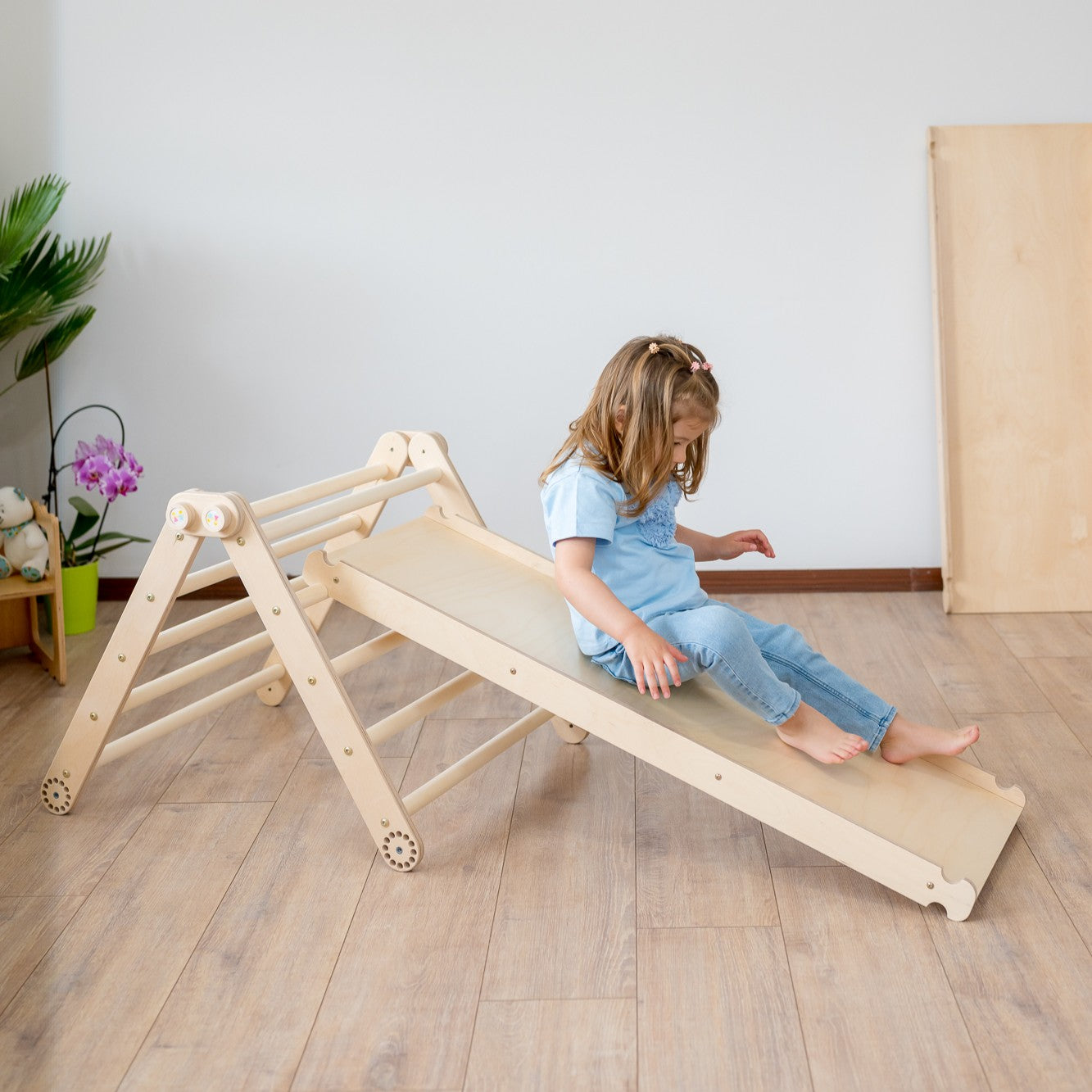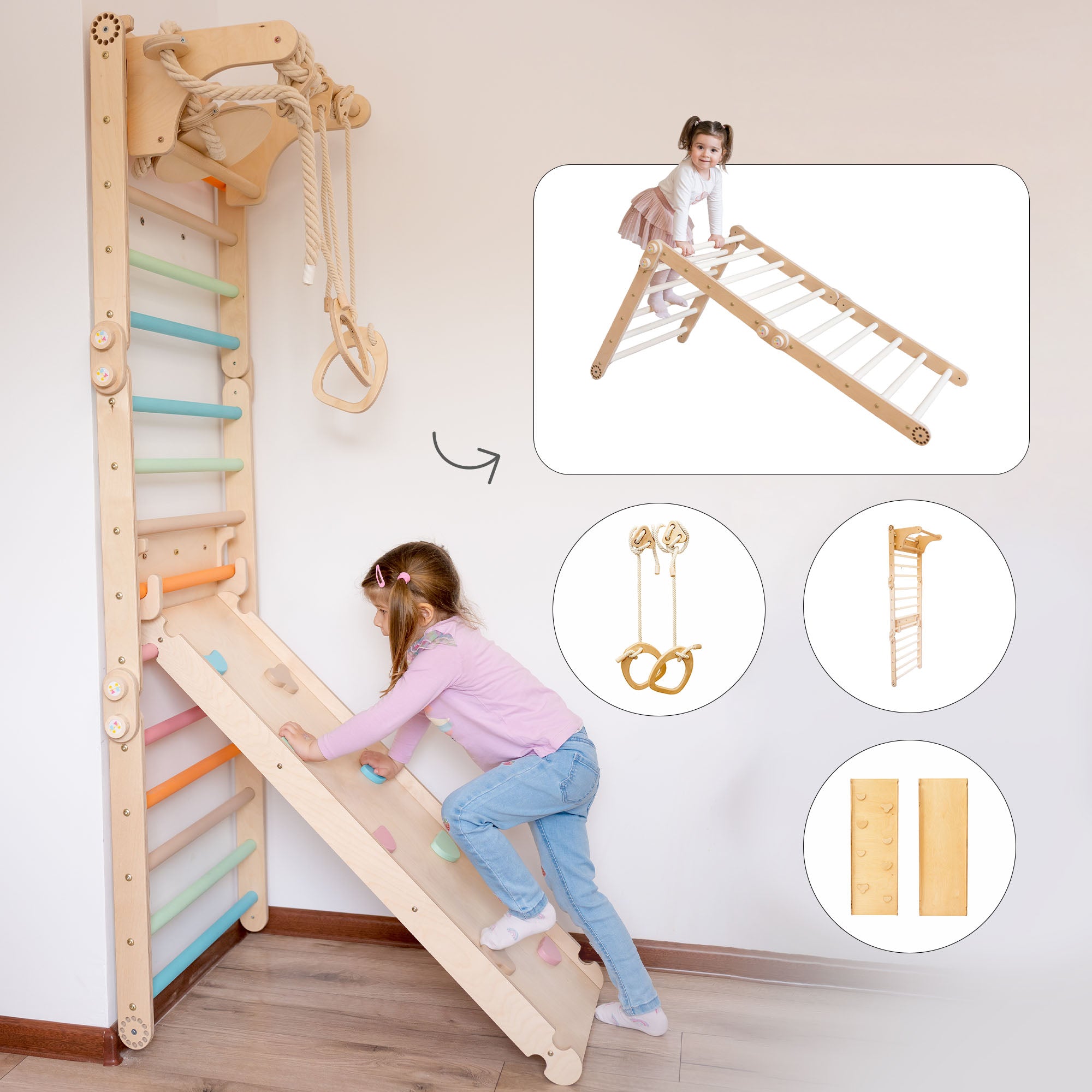 Toate seturile noastre de cățărare sunt modulare, permițând ca modulele individuale să fie legate între ele și ca ansamblurile să fie schimbate și îmbunătățite în funcție de dezvoltarea și interesele copilului. Pentru peretele suedez, folosim aceleași module (scări) din care sunt făcute triunghiurile Pickler, adăugând câteva atașamente și accesorii suplimentare pentru și mai multă distracție. Pentru a realiza peretele suedez, cele trei scări sunt pliate la 180° și devine o singură scară mare. Aceasta este ușor de ridicat și de agățat pe atașamentul deja montat pentru perete.